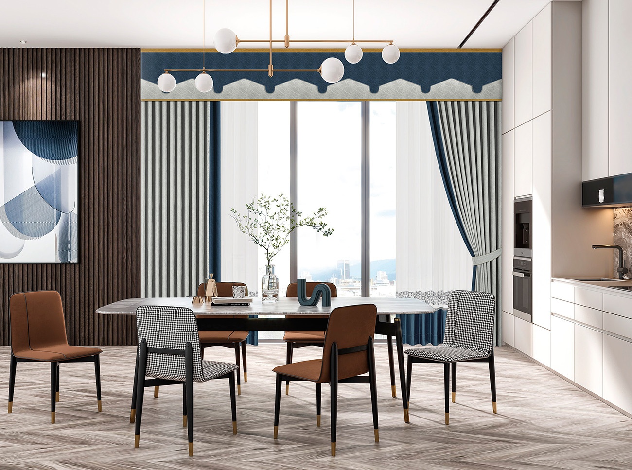 如同被海水反復(fù)沖刷打磨的鵝卵石灰,構(gòu)筑了形如城堡的抽象圖形,大理石般的優(yōu)美紋理渲染出高貴而簡約的氣質(zhì)。寧靜的皇室藍(lán)平靜下都市生活的喧囂,賦予空間別樣的格調(diào)與治愈力,兩者完美的層次感打破沉悶,卻不會(huì)破壞優(yōu)雅平和的氛圍。
