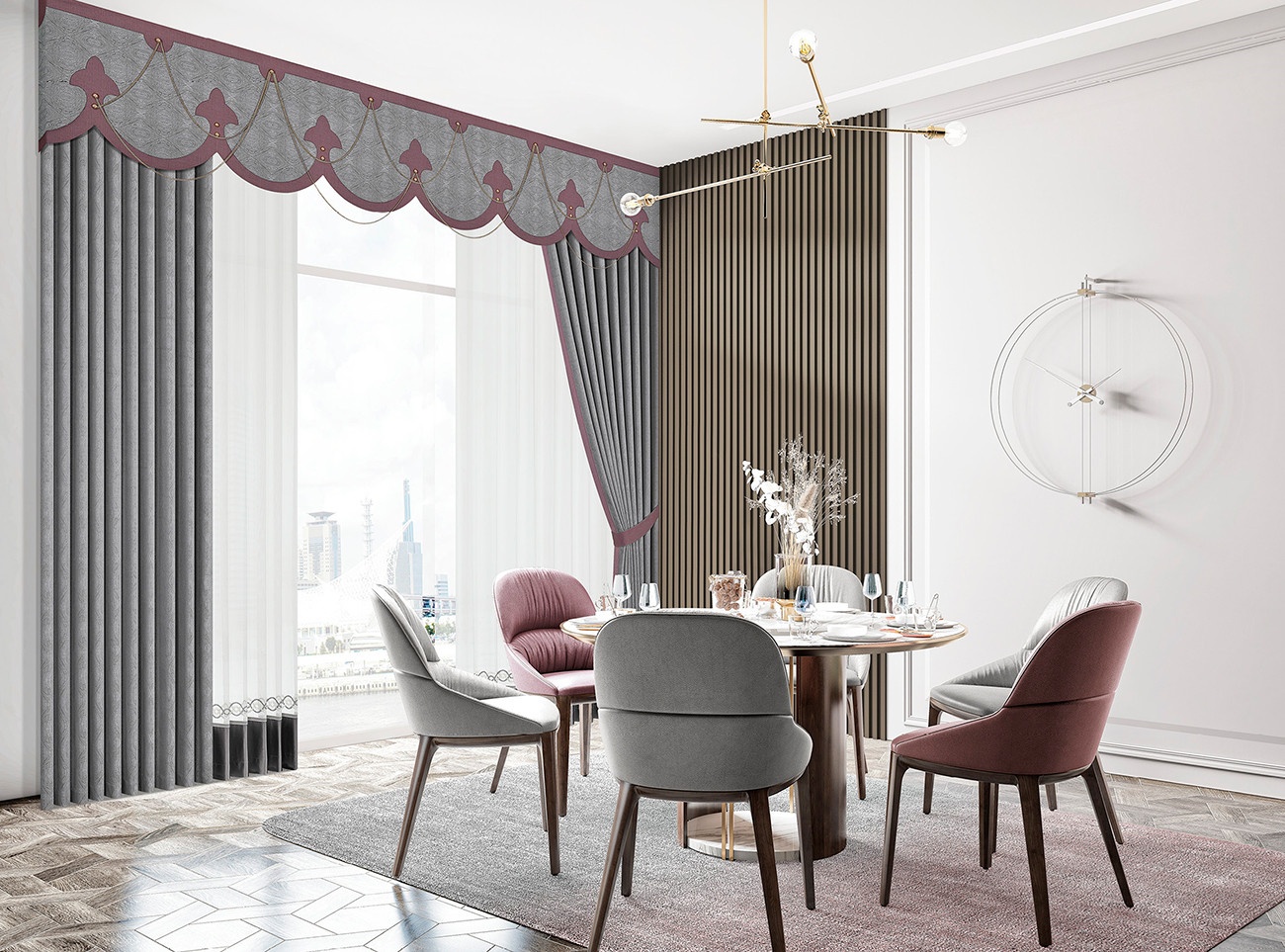 自帶紋理的莊重?zé)熁疑路鹗侵惺兰o(jì)古堡中歷經(jīng)歲月的大理石,赭石色的鳶尾花圖案延續(xù)著色彩帶來(lái)的優(yōu)雅體驗(yàn),流暢的弧形簾頭訴說(shuō)著古典美學(xué)的魅力。別出心裁的金色鏈飾更彰顯著歐洲皇室般的高貴氣質(zhì),優(yōu)美而不繁復(fù),簡(jiǎn)約而清麗。