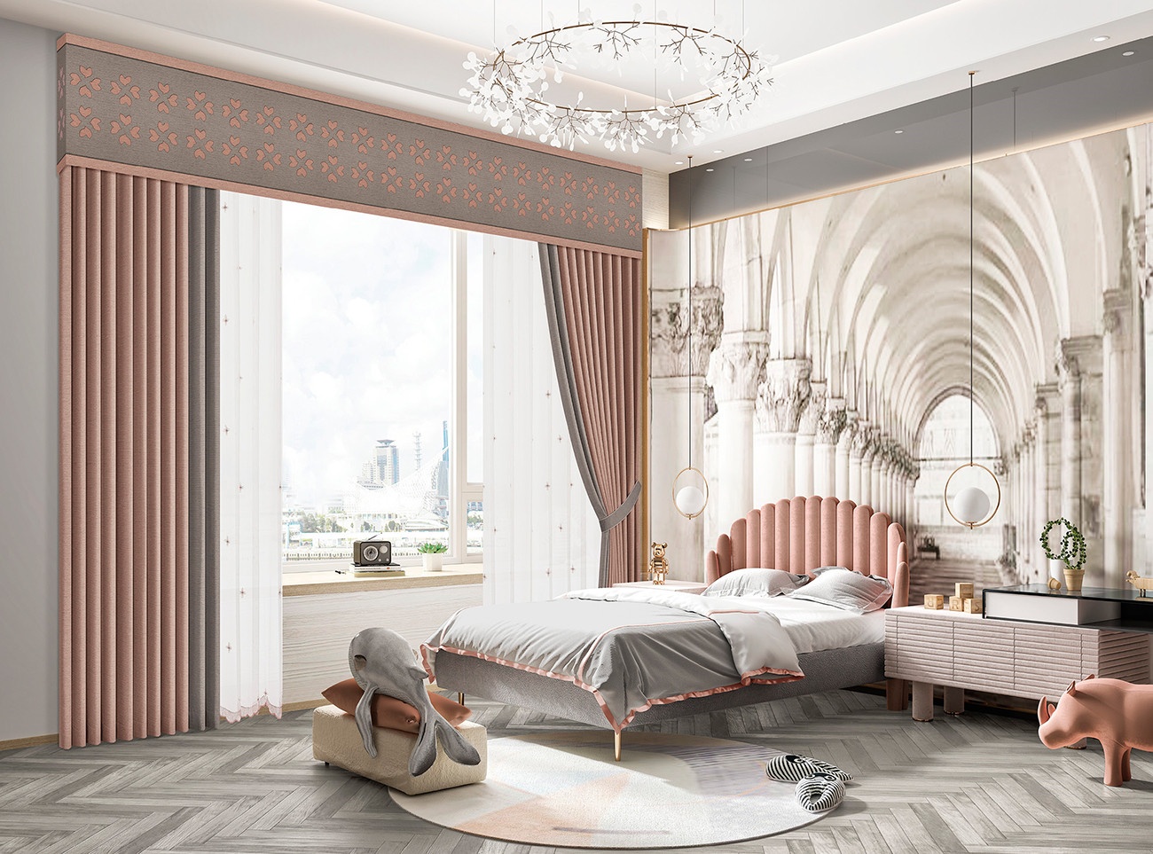 清新淡雅的茱萸粉讓整個(gè)家變得溫暖如春,當(dāng)迷人的茱萸粉遇上空間,充滿(mǎn)浪漫的氣息。搭配愛(ài)心花瓣圖案,增添現(xiàn)代都市感,甜美與雅致平衡地剛剛好。很好的詮釋了質(zhì)感并存的自由家居,描繪愜意舒適的居家生活。